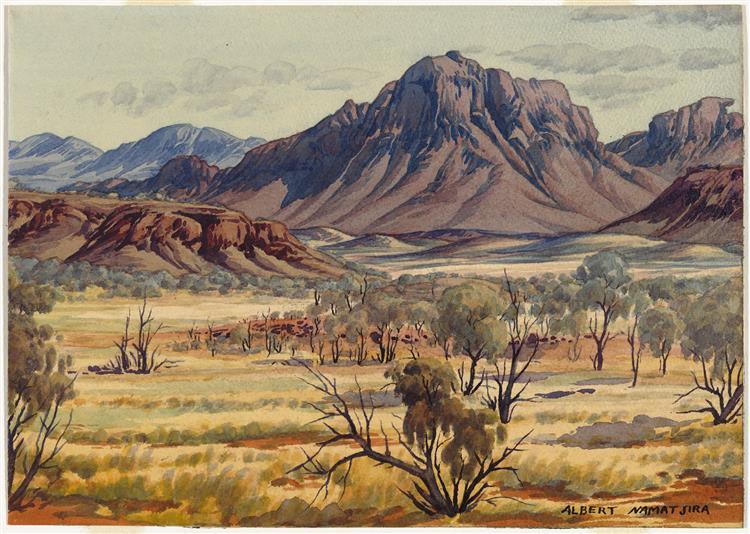 Namatjira had always displayed an affinity for painting and arts, and when he was in his thirties he learned about painting in watercolour from a white Australian artist, Rex Battarbee. Namatjira quickly mastered the medium and started creating beautiful landscape paintings. At this time, many white artists were coming to Australia to paint landscapes, and their works were typical of the European art styles, portraying realistic and romantic versions of the landscapes with a white European interpretation.